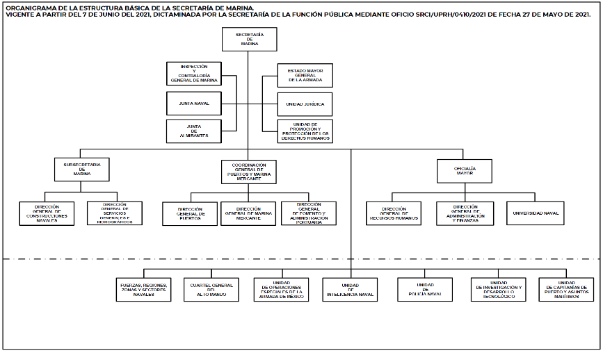 A efecto de consolidar a la Secretaría de Marina como Autoridad Marítima y estandarizar el esquema organizacional, en Oficio SSFP/408/1714/2017 de fecha 26 de diciembre de 2017, la Unidad de Política de Recursos Humanos de la Administración Pública Federal, Dirección General de Organización y Remuneración de la Secretaría de la Función Pública aprobaron y registraron la estructura orgánica de la Secretaría de Marina, con vigencia a partir del 11 de diciembre de 2017, ingresada en el Sistema para Aprobación y Registro de Estructuras Organizacionales (SAREO).