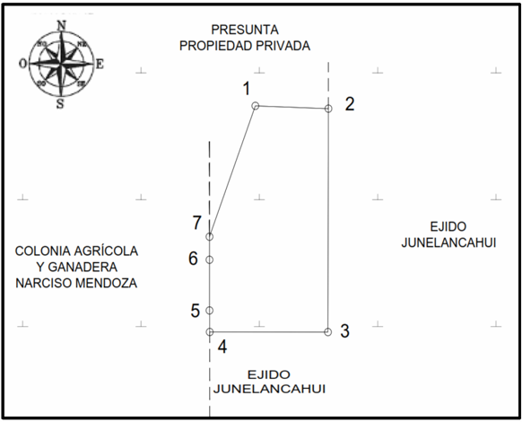 | Suroeste | Presunta propiedad privada, ejido Junelancahui, ejido Mariano Escobedo, calle y Colonia Agrícola y Ganadera "Narciso Mendoza". | 1,369.129 |