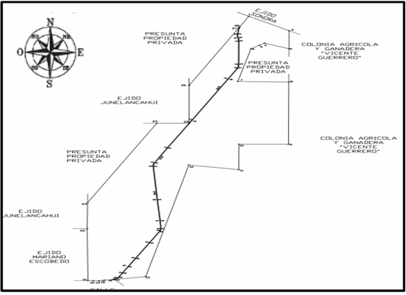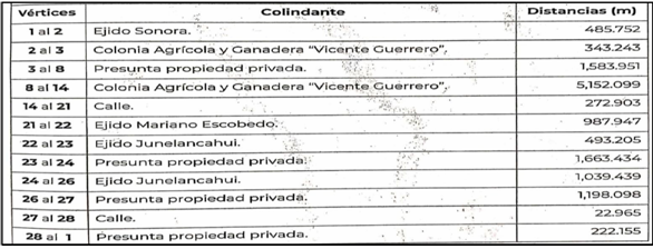 | Noreste | Presunta privada, calle, ejido Sonora, Colonia Agrícola y Ganadera "Vicente Guerrero" y presunta propiedad privada. | 6,485.936 |