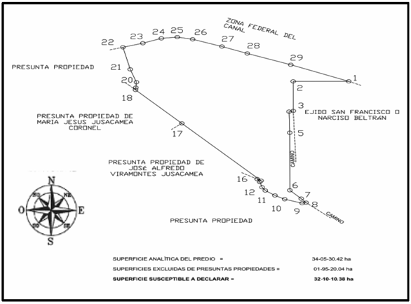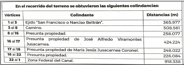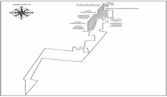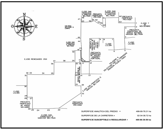 | Sureste | Ejido "San Francisco o Narciso Beltrán", camino, presunta propiedad y presunta propiedad de José Alfredo Viramontes Jusacamea. | 1,003.235 |