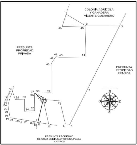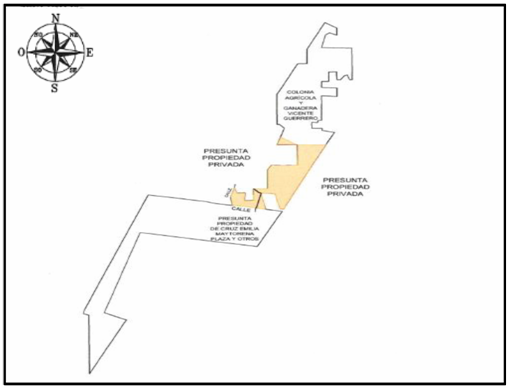 | Noroeste | Presunta propiedad privada y Colonia Agrícola y Ganadera "Vicente Guerrero". | 3,716.011 |