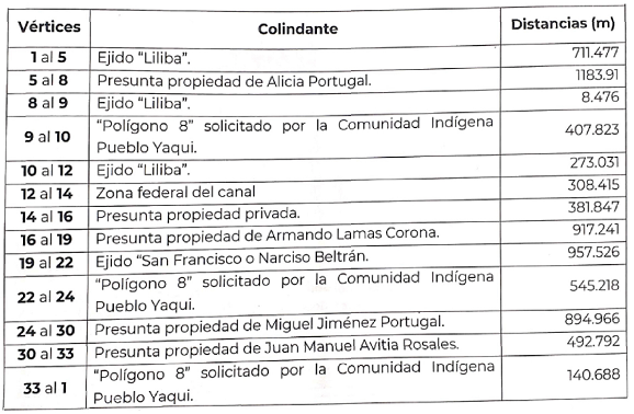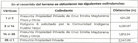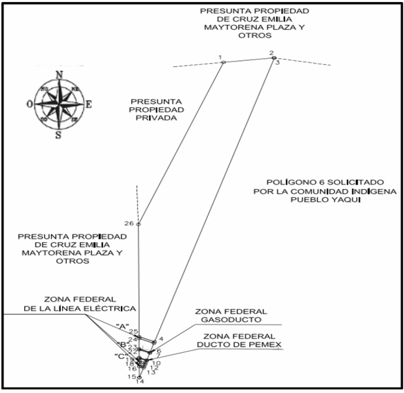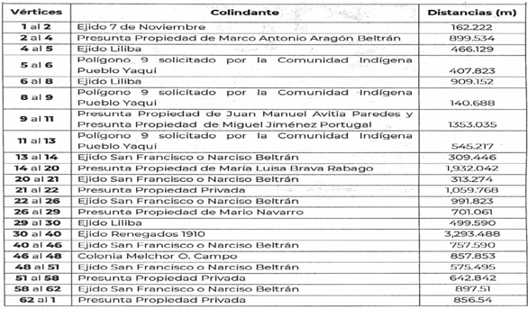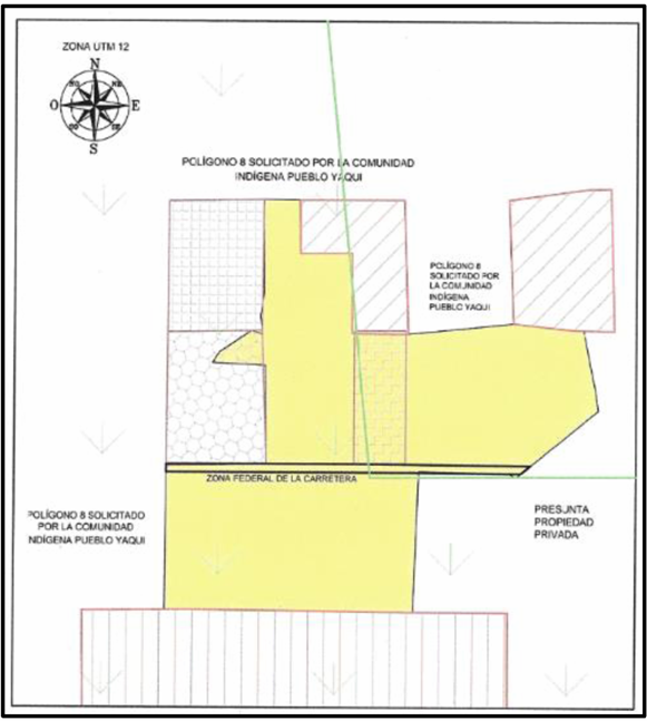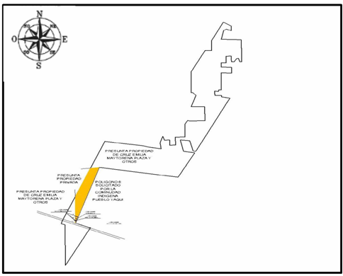 | Suroeste | Polígono 6 solicitado por la Comunidad Indígena Pueblo Yaqui y Presunta propiedad privada de Cruz Emilia Maytorena Plaza y otros. | 3,984.69 |