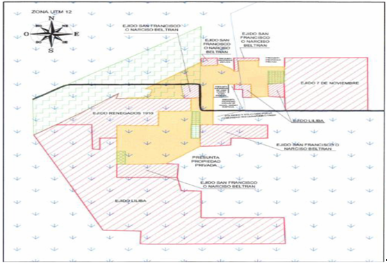| Suroeste | Presunta Propiedad Privada, Ejido San Francisco o Narciso Beltran, Presunta Propiedad de Mario Navarro, Ejido Liliba y Ejido Renegados 1910. | 4,678.62 |