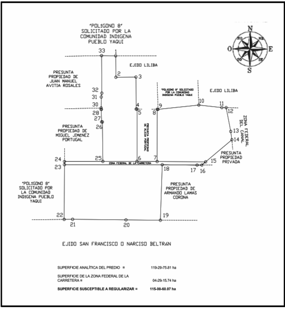 | Sureste | Polígono 9 solicitado por la Comunidad Indígena Pueblo Yaqui, Presunta Propiedad de María Luisa Brava Rabago, Ejido San Francisco o Narciso Beltrán y Presunta Propiedad Privada. | 3,252.70 |