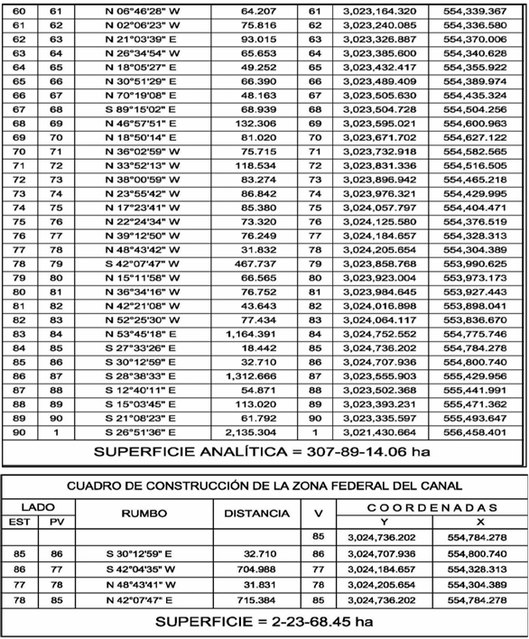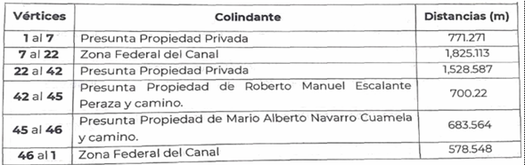 | Noreste | Presunta Propiedad de Mario Alberto Navarro Cuamela, Zona Federal del Canal y Presunta Propiedad Privada. | 1,046.928 |