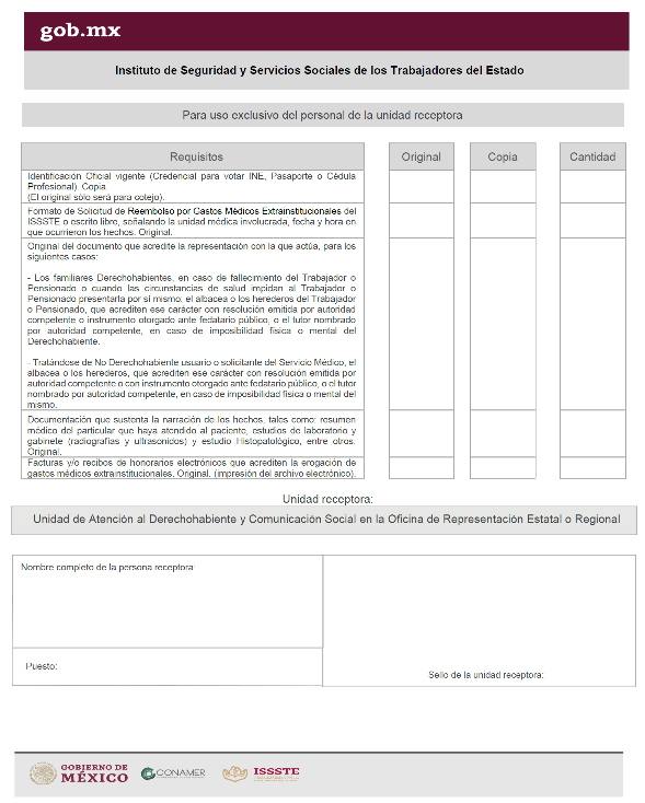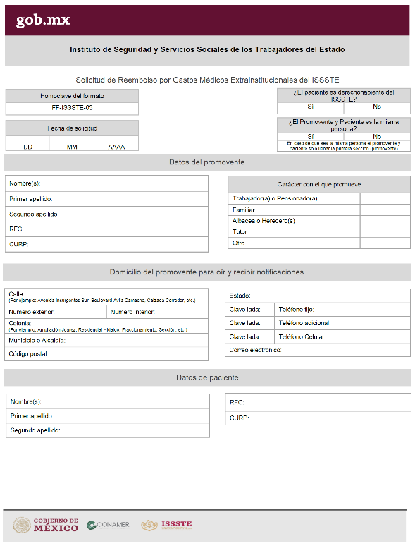 | Solicitud de Reembolso por Gastos Médicos Extrainstitucionales del ISSSTE. | FF- ISSSTE-03 | Solicitud de Reembolso por Gastos Médicos Extrainstitucionales del ISSSTE. |