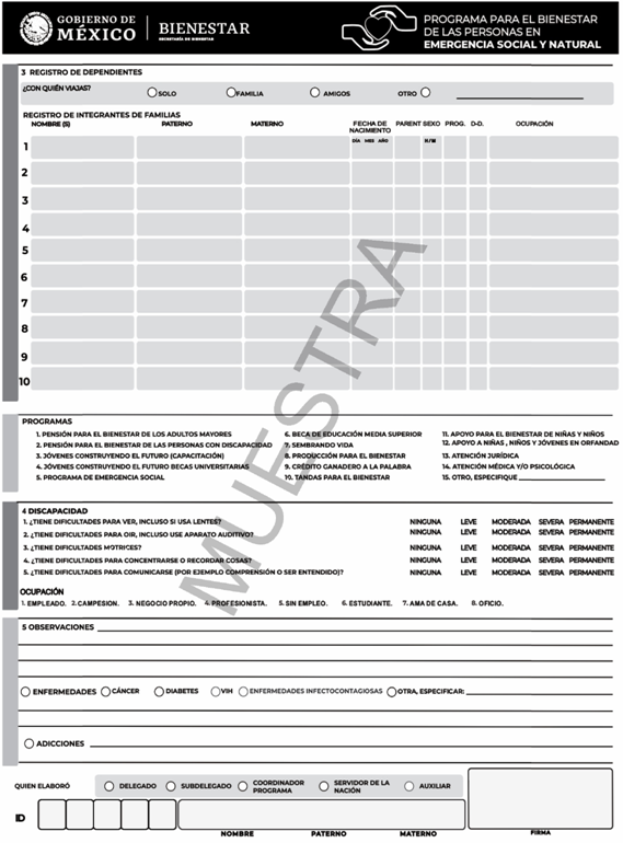Tal y como lo establece el numeral 3.3. en su párrafo segundo, para el caso de atención a migrantes en la frontera Sur, el Comité Técnico determinará los mecanismos de atención a las personas beneficiarias, quienes podrán acudir a los Módulos de Atención que para tales efectos se establezcan, donde las personas prestadoras de servicios o servidoras públicas recabarán la información necesaria a través de la Cédula de Bienestar para la Población Migrante (Anexo 4 de los presentes Lineamientos de Operación).