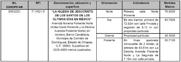 5.- Que la Secretaría de Hacienda y Crédito Público a través de su órgano administrativo desconcentrado Instituto de Administración y Avalúos de Bienes Nacionales, ha tenido la administración del inmueble federal identificado con el número de Registro Federal Inmobiliario 7-11921-5 y bajo el uso de la Asociación Religiosa denominada La Iglesia de Jesucristo de los Santos de los Últimos Días en México, A.R., con número de Registro SGAR/592/93, con la ubicación, superficie, medidas y colindancias correspondientes, descritos en el cuadro siguiente: