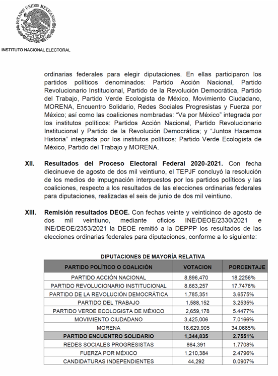 XVIII. Resultados del PEF 2020-2021. Con fecha diecinueve de agosto de dos mil veintiuno, el TEPJF concluyó la resolución de los medios de impugnación interpuestos por los partidos políticos y las coaliciones, respecto a los resultados de las elecciones ordinarias federales para diputaciones, realizadas el seis de junio de dos mil veintiuno.