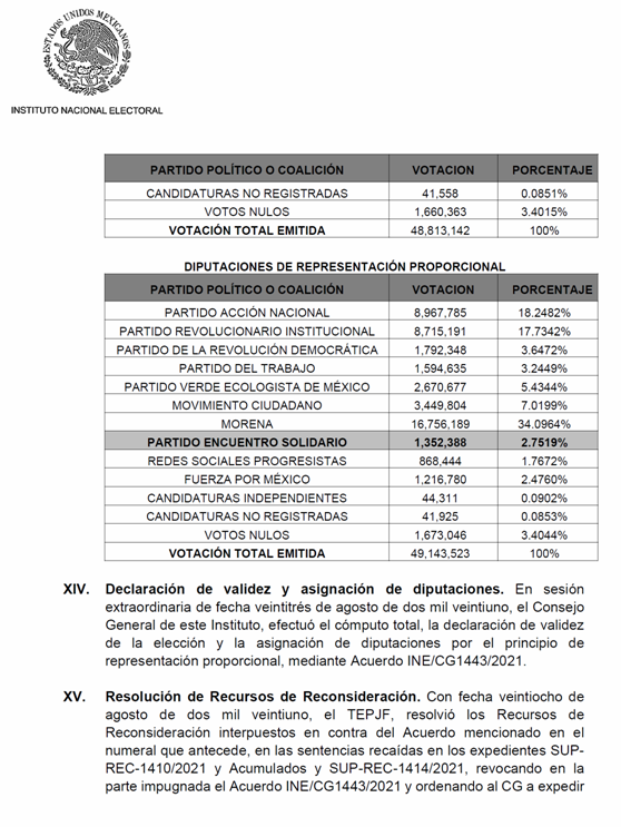 XX. Declaración de validez y asignación de diputaciones. El veintitrés de agosto de dos mil veintiuno, en sesión extraordinaria, el Consejo General del INE efectuó el cómputo total, la declaración de validez de la elección de diputaciones federales por el principio de representación proporcional y la asignación a los PPN Acción Nacional, Revolucionario Institucional, de la Revolución Democrática, del Trabajo, Verde Ecologista de México, Movimiento Ciudadano y MORENA las diputaciones que les corresponden, mediante Acuerdo INE/CG1443/2021, publicado el uno de septiembre de dos mil veintiuno en el DOF.
