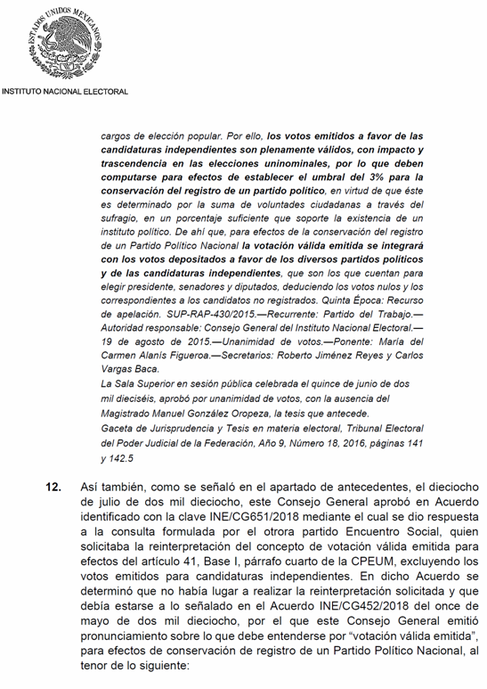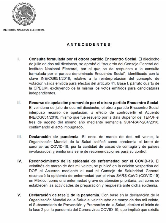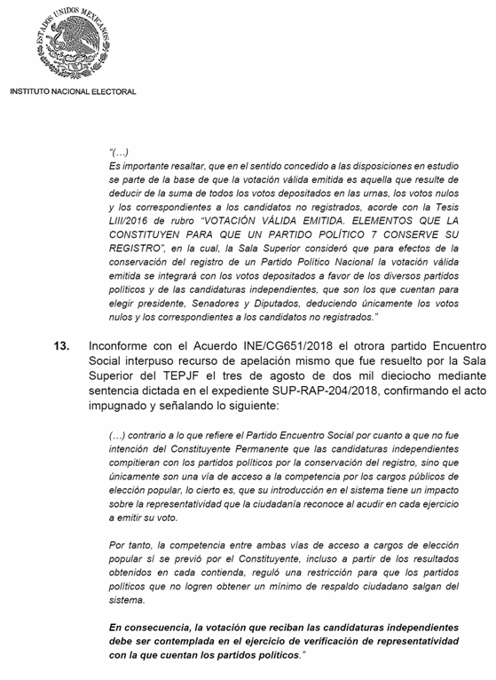 I. Consulta formulada por el otrora partido Encuentro Social. El dieciocho de julio de dos mil dieciocho, se aprobó el "Acuerdo del Consejo General del Instituto Nacional Electoral, por el que se da respuesta a la consulta formulada por el partido denominado Encuentro Social", identificado con la clave INE/CG651/2018, relativo a la reinterpretación del concepto de votación válida emitida para efectos del artículo 41, Base I, párrafo cuarto de la CPEUM, excluyendo de la misma los votos emitidos para candidaturas independientes.