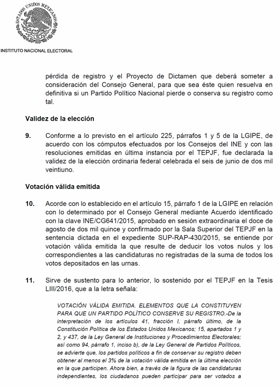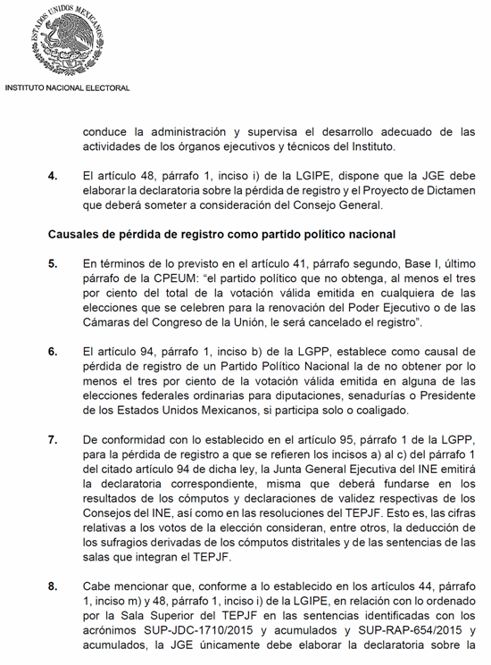 4. En términos de lo previsto en el artículo 41, párrafo tercero, Base I, último párrafo de la CPEUM: "el partido político que no obtenga, al menos el tres por ciento del total de la votación válida emitida en cualquiera de las elecciones que se celebren para la renovación del Poder Ejecutivo o de las Cámaras del Congreso de la Unión, le será cancelado el registro".
