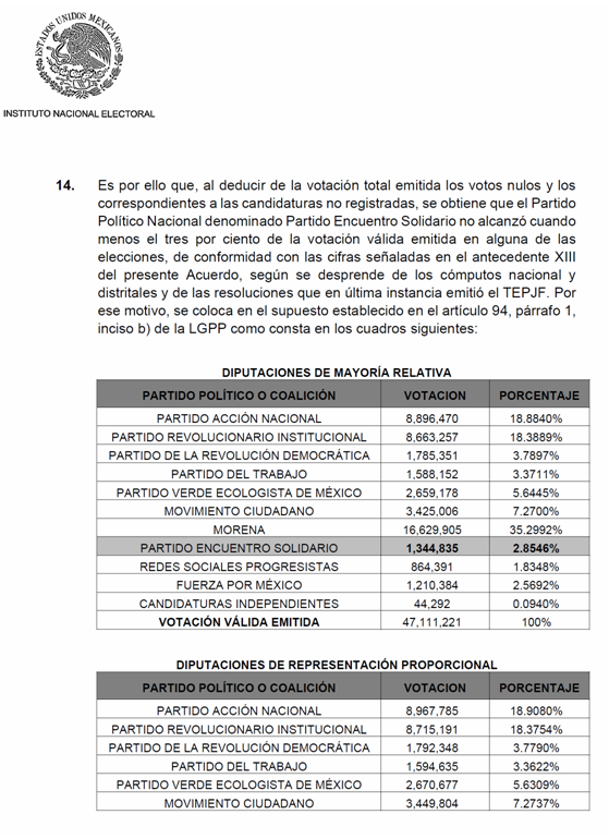 SEGUNDO.- Se declara la pérdida de registro como Partido Político Nacional, del Partido Encuentro Solidario, en virtud de que al no haber obtenido el tres por ciento de la votación válida emitida en la elección federal ordinaria celebrada el seis de junio de dos mil veintiuno, se ubicó en la causal prevista en el artículo 41, párrafo tercero, Base I, párrafo cuarto de la CPEUM y 94, párrafo 1, inciso b) de la LGPP.