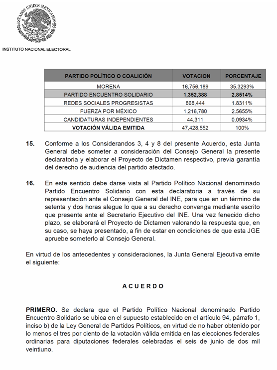 "PRIMERO. Se declara que el Partido Político Nacional denominado Partido Encuentro Solidario se ubica en el supuesto establecido en el artículo 94, párrafo 1, inciso b) de la Ley General de Partidos Políticos, en virtud de no haber obtenido por lo menos el tres por ciento de la votación válida emitida en las elecciones federales ordinarias para diputaciones federales celebradas el seis de junio de dos mil veintiuno." [sic]