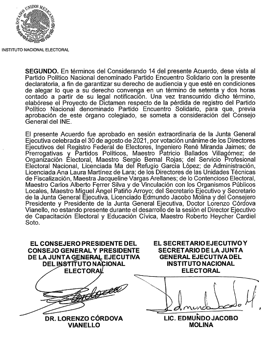 "SEGUNDO. En términos del Considerando 14 del presente Acuerdo, dese vista al Partido Político Nacional denominado Partido Encuentro Solidario con la presente declaratoria, a fin de garantizar su derecho de audiencia y que esté en condiciones de alegar lo que a su derecho convenga en un término de setenta y dos horas contado a partir de su legal notificación. Una vez transcurrido dicho término, elabórese el Proyecto de Dictamen respecto de la pérdida de registro del Partido Político Nacional denominado Partido Encuentro Solidario, para que, previa aprobación de este órgano colegiado, se someta a consideración del Consejo General del INE." [sic]