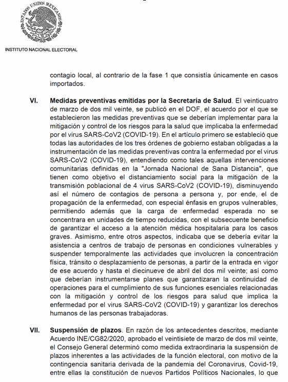 X. Suspensión de plazos. En razón de los antecedentes descritos, mediante Acuerdo INE/CG82/2020, aprobado el veintisiete de marzo de dos mil veinte, el Consejo General determinó como medida extraordinaria la suspensión de plazos inherentes a las actividades de la función electoral, con motivo de la contingencia sanitaria derivada de la pandemia de COVID-19, entre ellas la constitución de nuevos PPN, lo que contemplaba las garantías de audiencia y las diligencias que derivaran del análisis de las actas de certificación de asambleas.