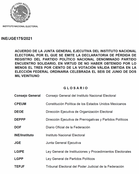 XXIII. Declaratoria de pérdida de registro. El treinta de agosto de dos mil veintiuno, la Junta General Ejecutiva de este Instituto aprobó el Acuerdo INE/JGE175/2021, mediante el cual se emitió la declaratoria de pérdida de registro del PPN denominado Encuentro Solidario al no haber alcanzado el tres por ciento de la votación válida emitida en la elección federal ordinaria celebrada el seis de junio de dos mil veintiuno. (Anexo 1)
