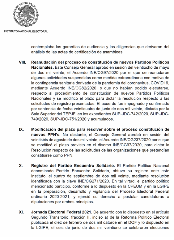 XV. Registro del Partido Encuentro Solidario. El PPN denominado Partido Encuentro Solidario, obtuvo su registro ante este Instituto, el cuatro de septiembre de dos mil veinte, mediante Resolución identificada con la clave INE/CG271/2020. En tal virtud, el partido político mencionado participó, conforme a lo dispuesto en la CPEUM y a la LGIPE en la preparación, desarrollo y vigilancia del PEF ordinario 2020-2021, y ejerció su derecho a postular candidaturas a diputaciones por ambos principios.