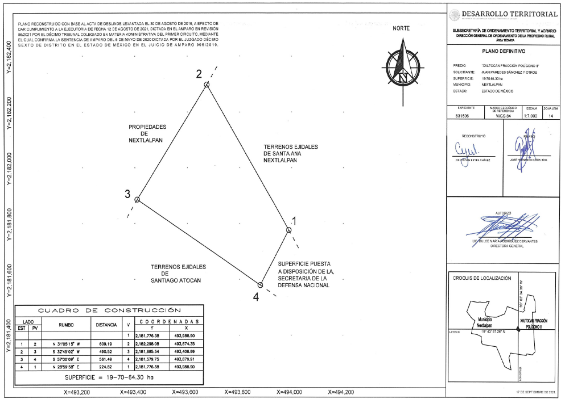 Por lo anterior y en virtud de que se trata de una obra que forma parte del Plan Nacional de Desarrollo 2019-2024, publicado en el Diario Oficial de la Federación el 12 de julio de 2019, el 12 de agosto de 2021 se emitió el "ACUERDO mediante el cual la Secretaría de Desarrollo Agrario, Territorial y Urbano pone a disposición de la Secretaría de Hacienda y Crédito Público a través del Instituto de Administración y Avalúos de Bienes Nacionales, la superficie de 5-00-00 hectáreas del polígono II, predio Xaltocan, Municipio de Nextlalpan, Estado de México, a efecto de que la superficie sea destinada al proyecto de construcción del Aeropuerto Internacional Felipe Ángeles", publicado en el Diario Oficial de la Federación el 20 de agosto del 2021, cuyo plano y cuadro de construcción son los siguientes: