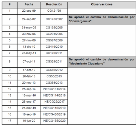 II. Aprobación de modificaciones anteriores a los Documentos Básicos de Movimiento Ciudadano. En las siguientes sesiones, el Consejo General del otrora IFE, así como del INE, aprobó diversas modificaciones a los Documentos Básicos de Movimiento Ciudadano: