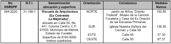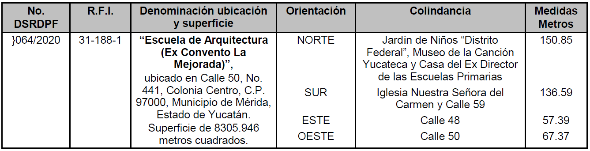 Primero.- Que con fecha 18 de diciembre de 2020, se publicó en el Diario Oficial de la Federación la Declaratoria de fecha 07 de diciembre del 2020, por la que se establece que el inmueble denominado "Escuela de Arquitectura (Ex Convento La Mejorada)", ubicado en Calle 50, No. 441, Colonia Centro, C.P. 97000, Municipio de Mérida, Estado de Yucatán, con superficie de 8305.946 metros cuadrados, se encuentra sujeto al régimen de dominio público de la Federación.