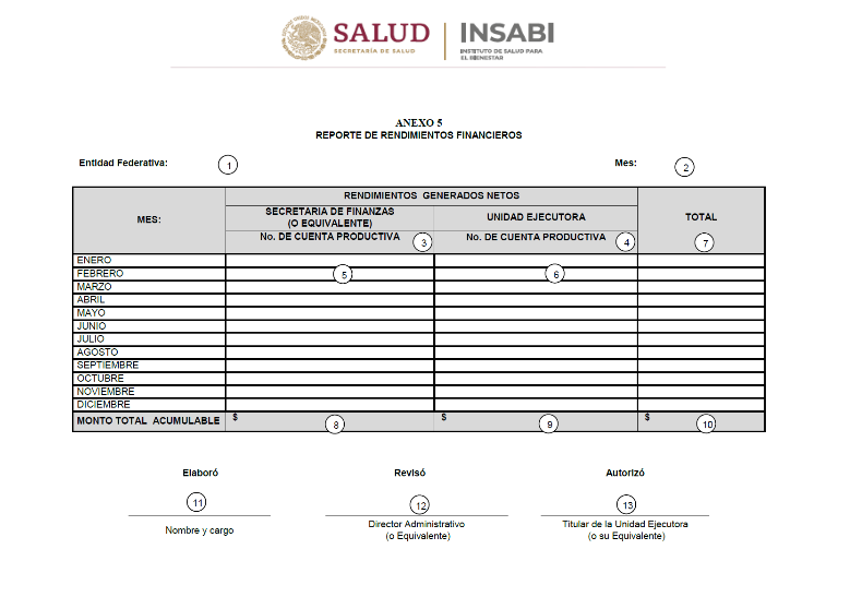 Nota: La Unidad Ejecutora deberá de presentar de manera mensual el registro y control del Formato "Reporte de Rendimientos Financieros" ante el INSABI, acompañado de los estados de cuenta bancarios de la Secretaría de Finanzas (o su equivalente) y de la Unidad Ejecutora.