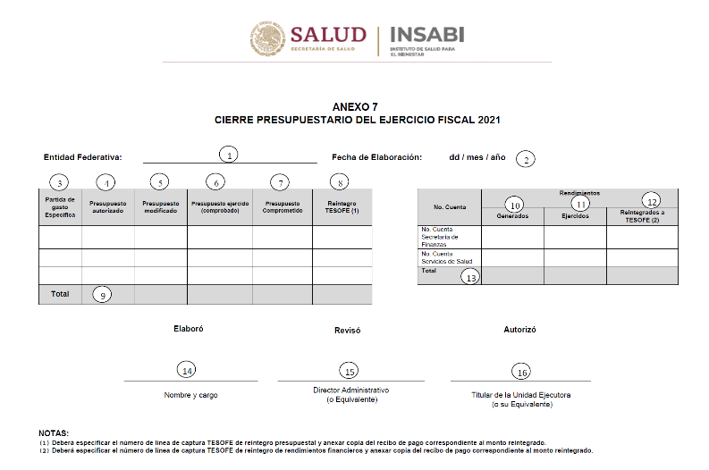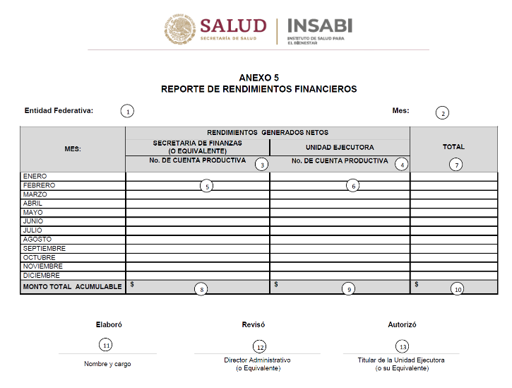 Nota: La Unidad Ejecutora deberá de presentar de manera mensual el registro y control del Formato "Reporte de Rendimientos Financieros" ante el INSABI, acompañado de los estados de cuenta bancarios de la Secretaría de Finanzas (o su equivalente) y de la Unidad Ejecutora.