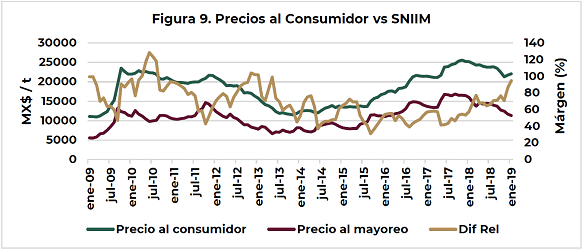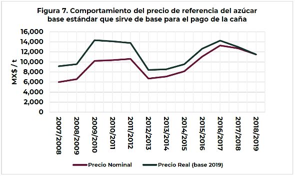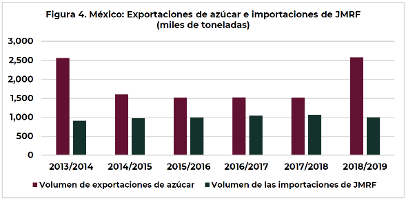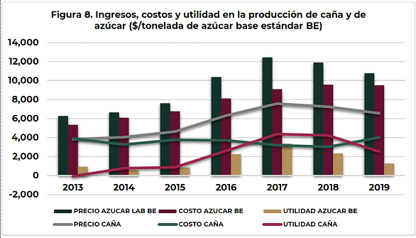 | Valor | 18.55 | En 2019 la diferencia entre el precio de venta del JMRF y el azúcar fue de 18.55% menos el precio del JMRF con respecto al precio de venta del azúcar. | |||||||