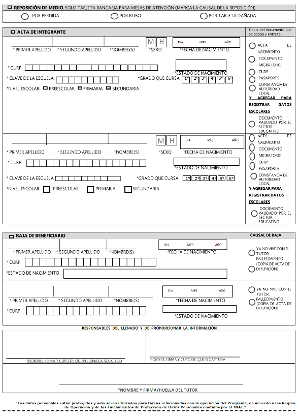 El que suscribe ______________________________________________tutor/a del alumno/a ___________________________________ con CURP __________, del plantel (indicar el nombre) ______________, beneficiario/a de la Beca de Educación Básica para el Bienestar Benito Juárez.