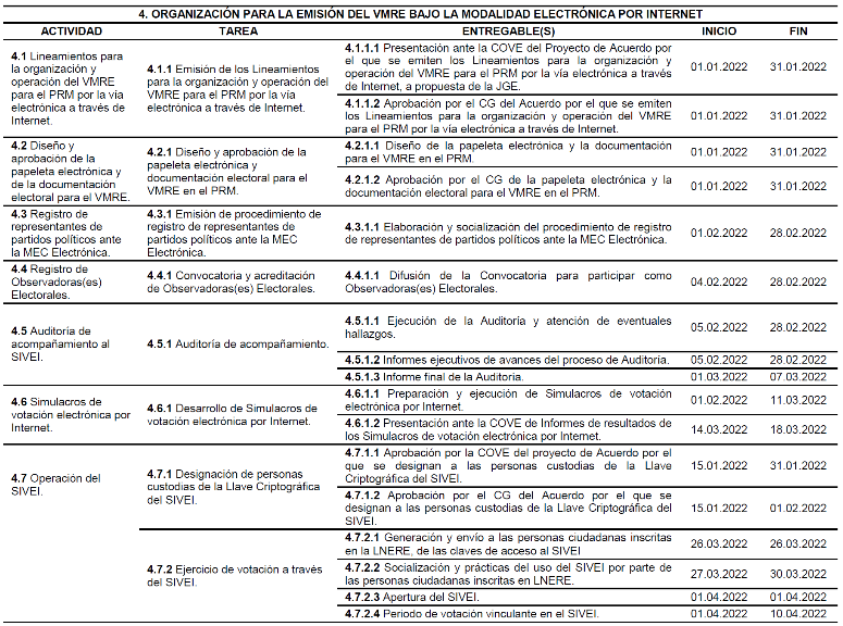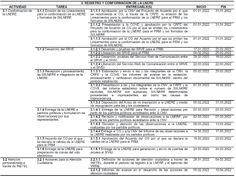 No se omite mencionar que las actividades y fechas referidas en cada una de las Fases del Plan Integral de Trabajo del VMRE en el PRM, y que se encuentran relacionadas en el cronograma de actividades, podrán modificarse o actualizarse a causa de situaciones supervinientes ajenas al cumplimiento de las actividades de las áreas involucradas. De lo anterior, se informará a la COVE, junto con la justificación de la modificación o adecuación a las actividades y fechas que resulten afectadas.