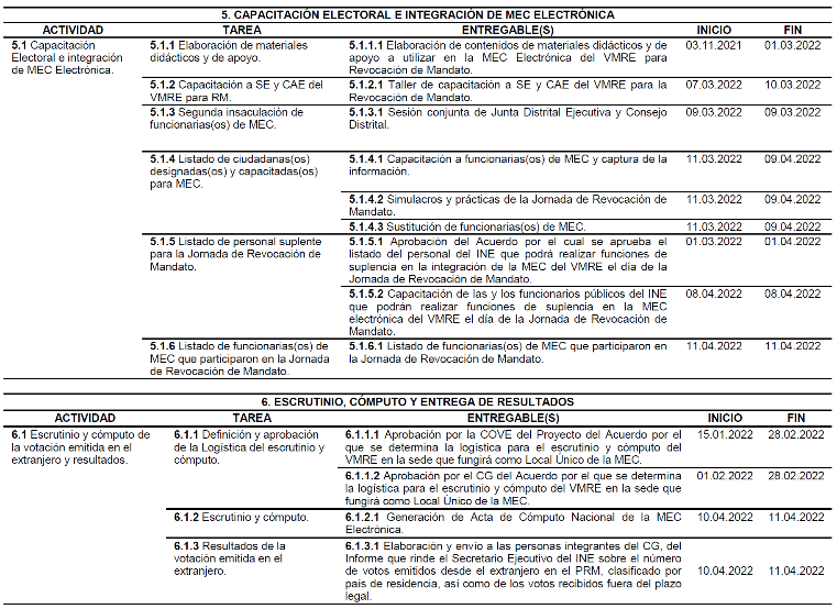 - Las personas mexicanas ciudadanas residentes en el extranjero podrán ejercer su derecho al voto en la Revocación de Mandato, a través de la modalidad electrónica por Internet, debiendo aprobarse por el CG, a más tardar en el mes de enero de 2022, los Lineamientos correspondientes para establecer los mecanismos y procedimientos para la conformación de la Lista Nominal de Electores Residentes en el Extranjero; para la organización y operación del voto electrónico por Internet; así como para la integración de la Mesa de Escrutinio y Cómputo Electrónica y la Capacitación Electoral, y la acreditación de representantes de partidos políticos ante dicha Mesa.