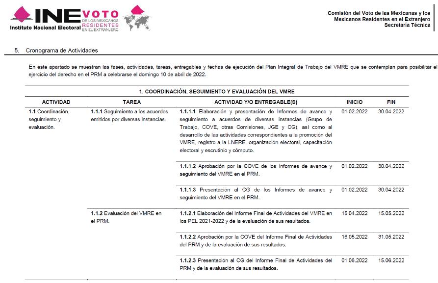Finalmente, en el Programa de Trabajo de la COVE se establece, dentro del eje temático "Planeación, organización e instrumentación del VMRE en los Procesos Electorales y de Participación Ciudadana", en la Actividad 4.1.2., la presentación y, en su caso, aprobación en este Consejo General, a través de la COVE, del Plan Integral de Trabajo del VMRE en los Procesos de Participación Ciudadana que tengan lugar, en su caso, en 2022 y 2023, como es el caso del PRM del Presidente de la República electo para el periodo constitucional 2018-2024, en tanto constituye parte de los proyectos relativos a las actividades y tareas a desarrollar por parte de las instancias de dirección, áreas ejecutivas y órganos desconcentrados del INE, a fin de solicitar la información necesaria y verificar su cumplimiento.