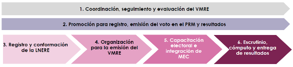 - Coordinar con las Direcciones Ejecutivas y Unidades Técnicas del INE, la implementación de las actividades de organización y emisión del VMRE, relativas al seguimiento y evaluación del proyecto institucional; la difusión y promoción para registro, emisión del voto y resultados; registro y conformación de la LNERE; organización para la emisión del voto; capacitación electoral e integración de MEC, así como escrutinio, cómputo y resultados;