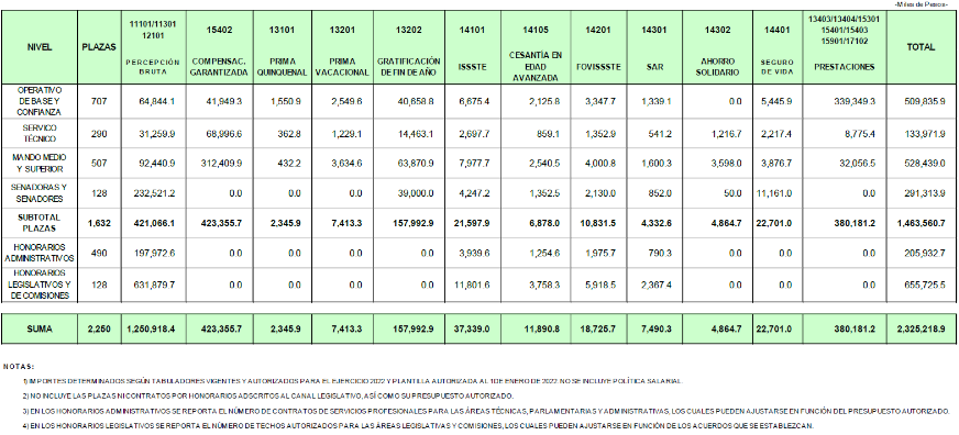 Con fundamento en lo establecido en los artículos 70, 75, 77 fracción I y 127 de la Constitución Política de los Estados Unidos Mexicanos; 66 inciso i), 108 y 110 inciso c) de la Ley Orgánica del Congreso General de los Estados Unidos Mexicanos; 1 párrafo 2°. 17, 61 fracción II inciso a) y 62 de la Ley General de Contabilidad Gubernamental; 1 párrafo 3°, 4, 5, 6, 9, 14 y 24 de la Ley Federal de Remuneraciones de los Servidores Públicos; 1 y 2 de la Ley Federal de Austeridad Republicana; 5 fracción I, 6 párrafo 2°, 20, 64, 65 y 66 de la Ley Federal de Presupuesto y Responsabilidad Hacendaria; 20 del Decreto de Presupuesto de Egresos de la Federación para el Ejercicio Fiscal 2022; así como en los artículos 20 incisos f), h) y n) y 23 del Estatuto para los Servicios Parlamentarios, Administrativos y Técnicos del Senado de la República y, conforme al Acuerdo por el que se Establecen Criterios y Medidas de Austeridad Presupuestal en el Senado de la República, publicado en la Gaceta del Senado el 4 de septiembre de 2018 y por acuerdos de la Mesa Directiva y de la Comisión de Administración, la Secretaría General de Servicios Administrativos publica el siguiente: