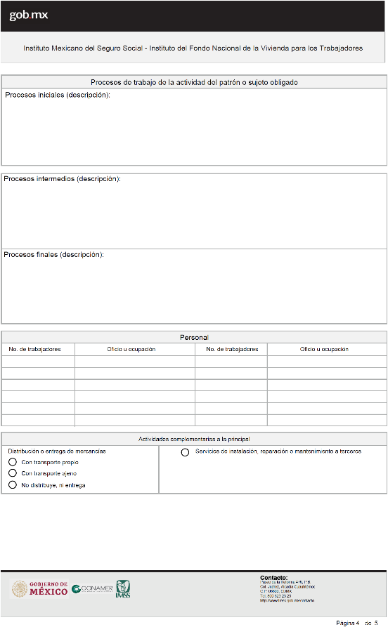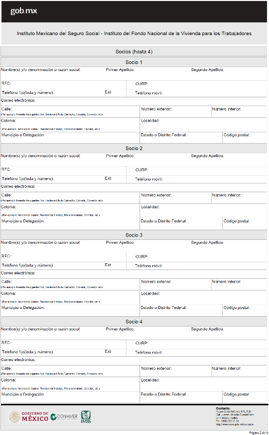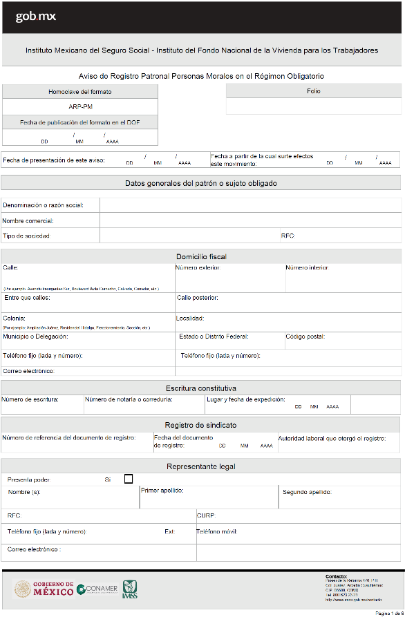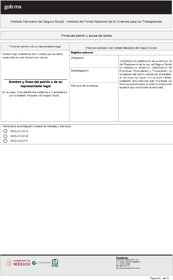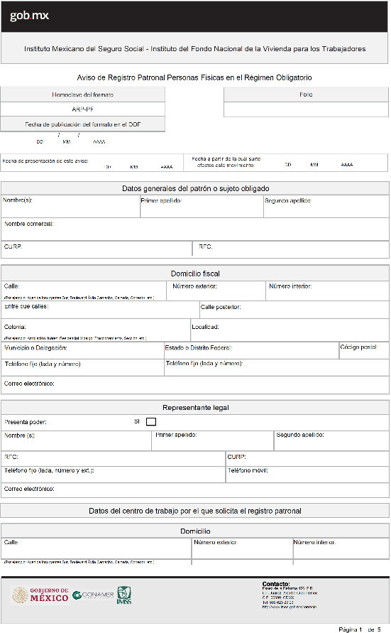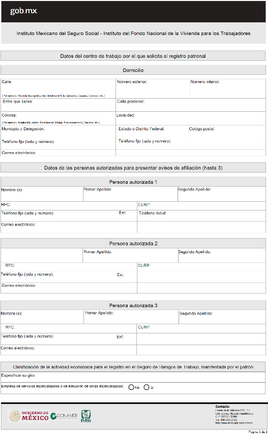 | PLAZO MÁXIMO DE LA RESOLUCIÓN DEL TRÁMITE 1 día hábil. PLAZO DE PREVENCIÓN Inmediato. VIGENCIA DEL TRÁMITE 1 año. DATOS Del Patrón Persona Física con trabajadores asegurados a su servicio: 1. Clave Única de Registro de Población (CURP). 2. Número de Seguridad Social. 3. Correo electrónico 4. En su caso, datos para responder cuestionario médico proporcionado por el IMSS, llenado por el solicitante y por cada familiar a asegurar, cuando aplique, original. DOCUMENTOS Del Patrón Persona Física con trabajadores asegurados a su servicio: 1. Identificación oficial vigente. Original y Copia. 2. Comprobante de domicilio. Original y Copia. |