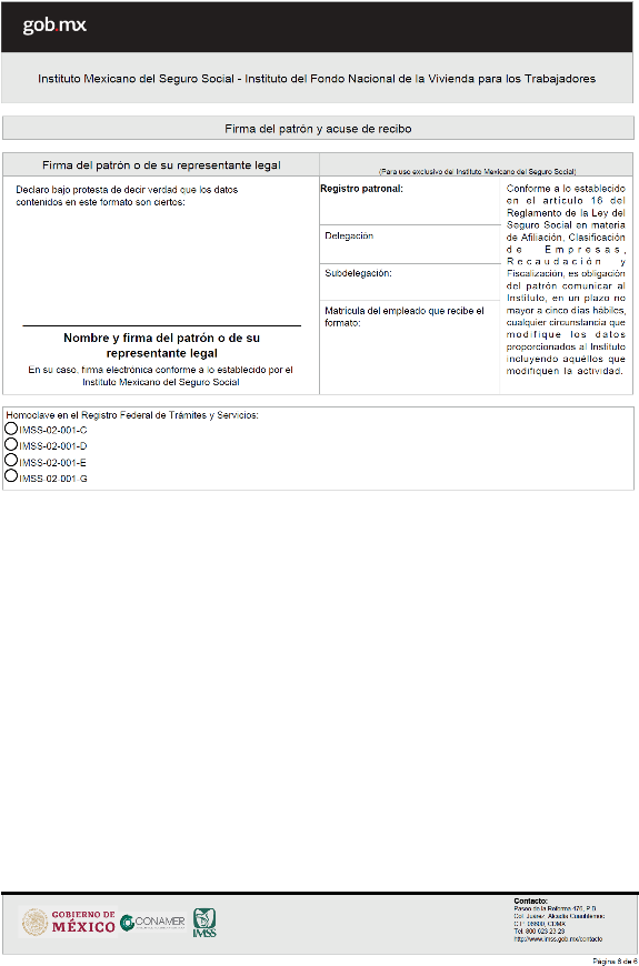| PLAZO MÁXIMO DE LA RESOLUCIÓN DEL TRÁMITE 5 días hábiles. PLAZO DE PREVENCIÓN 2 días hábiles siguientes a la presentación del aviso. VIGENCIA DEL TRÁMITE La inscripción termina por: 1. Declaración expresa firmada por el asegurado. 2. Que el asegurado deje de pagar las cuotas durante dos meses. 3. Que el asegurado sea dado alta o haya reingresado al régimen obligatorio. DATOS Datos generales del patrón o sujeto obligado 1. Clave Única de Registro de Población (CURP). 2. Número de Seguridad Social. 3. Correo electrónico. DOCUMENTOS 1. Identificación oficial vigente original y copia. 2. Escrito libre solicitando la inscripción en la continuación voluntaria en el régimen obligatorio, con firma autógrafa o huella digital. Original y Copia. 3. Comprobante de domicilio. Original y Copia. |