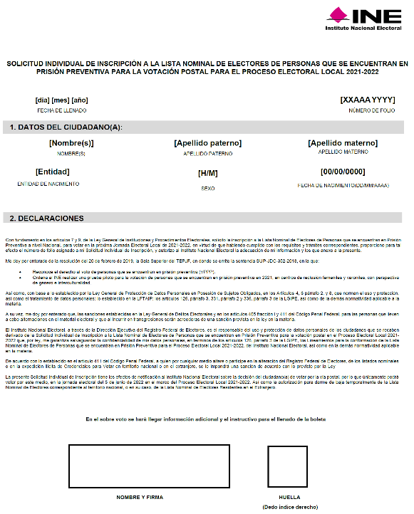 De acuerdo con los numerales 23 y 24 de los LVPPP, el personal de las JDE asistirá junto con las autoridades de la SSPEH a los Centros Penitenciarios para entregar las invitaciones, los formatos de SIILNEPP y sus correspondientes instructivos a las personas que se encuentren en prisión preventiva que deseen ejercer de su voto en esta modalidad. Las personas que se encuentren en prisión preventiva que deseen ejercer su voto por esta modalidad deberán llenar la SIILNEPP, firmarla y estampar en ella su huella digital. Posteriormente, entregarán el documento llenado al personal de las JDE para que ellos a su vez la remitan a la DERFE a través de la JLE.