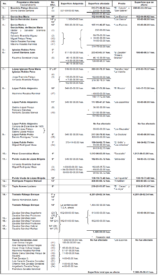 | 9 | López Pulido Pedro | 6° 7° | 217-30-79.93 has. 189-54-62.75 has. | "La Ocotera" "El Grillo" y "Los Limones" |