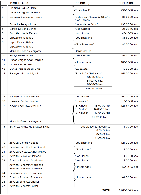 | 1 | Brambila Pelayo Dionisio | 2° | 513-71-49.49 has. | "El Colorín" o "San Gabriel" |