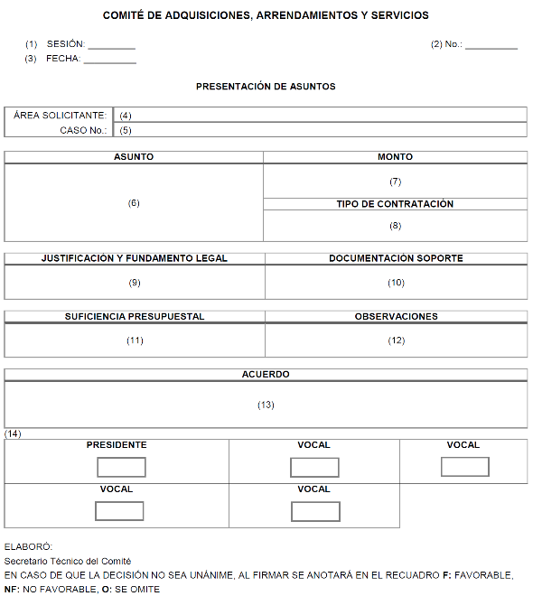 | 14 | Todos los integrantes del Comité con derecho a voto firmarán cada asunto que se presente, en caso de que la decisión que se tome no sea unánime en el recuadro inferior marcará el sentido de su voto | F: Favorable NF: No Favorable O: Se omite |