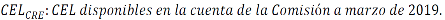 II. De conformidad con el Considerando Décimo Segundo del "Acuerdo de la Comisión Reguladora de Energía por el que se establece el criterio para la asignación de certificados de Energías Limpias disponibles en la cuenta de la Comisión Reguladora de Energía, correspondientes al año de obligaciones 2018, se define que el saldo de CEL al mes de marzo de 2019 fue de 2,016,056 CEL.