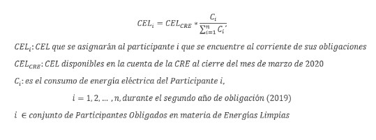 De conformidad con lo descrito en el numeral anterior, el criterio para la asignación de CEL disponibles en la cuenta de la Comisión consiste en una prorrata del consumo que representa cada Participante Obligado en proporción al consumo total, tal como se describe en la siguiente fórmula:
