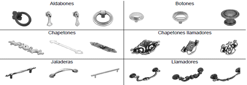 9. Los tipos de jaladeras de zamac incluidos en la investigación son estrictamente jaladeras, botones, chapetones llamadores, llamadores, chapetones y aldabones, como los que se ejemplifican en la Ilustración 2.
