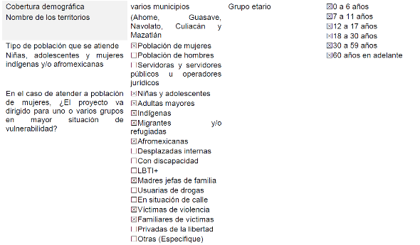 Cabe resaltar que de igual manera se enfocara el proyecto en zonas agrícolas de los municipios de Navolato, Ahome y Guasave donde radica el mayor porcentaje de mujeres indígenas que radican en el Estado.