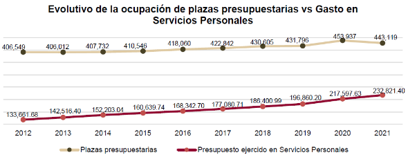 | Plazas presupuestarias | 453,937 | 443,119 | -10,818 | -2.4 |