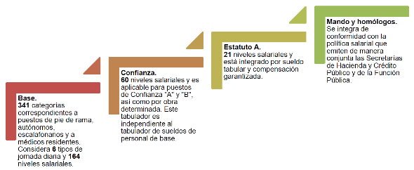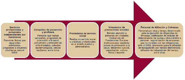 | 1/ No incluye las plazas de nómina ordinaria del Programa IMSS-BIENESTAR. 2/ El total registrado en 2021, representa al personal que cubrió una plaza vacante; adicional se realizaron 20,798 contrataciones para la cobertura de ausentismos y plaza cero. 3/ Notificador(a)/localizador(a), ejecutor(a), supervisor(a) de ejecutor, visitador(a), revisor(a), promotor(a) firma digital, promotor(a) del campo y promotor(a) clasificación de empresas, agente telefónico, supervisor(a) agente telefónico, apoyo a requerimientos de la Procuraduría de la Defensa del Contribuyente (PRODECON), apoyo administrativo y análisis fiscal. 4/ Considera a los prestadores de servicio social administrativos y del área médica. | ||||