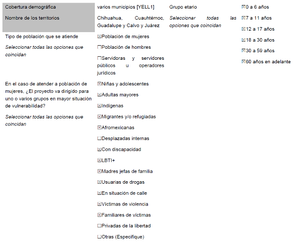 | Fortalecer la capacidad de atención a las Mujeres en el CAVIM de Juárez | Servicios Profesionales | X | X | X | X | X | X | X | $1,086,400.00 |