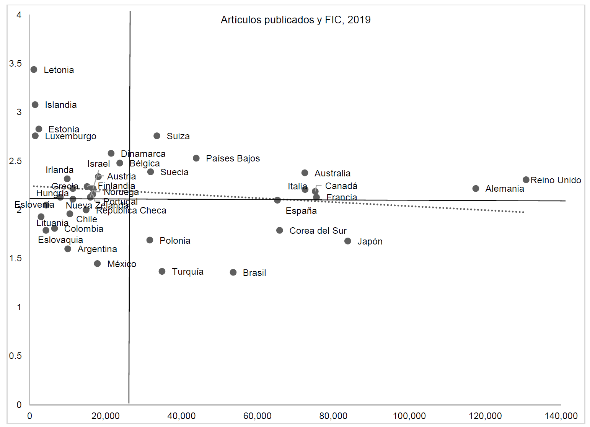 En el primer cuadrante se encuentran los países que tuvieron un FIC y un volumen de artículos superior al promedio; en el segundo cuadrante están los países que contaron con un FIC superior al promedio, pero con un volumen de publicaciones por debajo del promedio; en el tercer cuadrante, se ubican las naciones que tuvieron un número de artículos publicados y un FIC menor al promedio. Entre ellos se encuentra México junto con Eslovenia, Chile, República Checa, Nueva Zelanda, Lituania, Colombia, Eslovaquia y Argentina. Por último, en el cuarto cuadrante están los países que contaron con número de publicaciones científicas superior al promedio pero con un FIC menor al promedio.