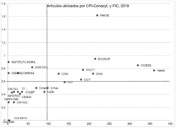 En un ejercicio análogo se comparan el número de artículos publicados y el FIC de los artículos científicos realizados por las personas investigadoras adscritas a los CPI del Conacyt según los datos nacionales, durante el 2019. De la misma manera se presenta la información en los cuadrantes; el CIMAT se ubicó en el tercer cuadrante entre los CPI que tuvieron un número de artículos publicados y un FIC menor al promedio, al igual que el Centro de Investigación e Innovación en Tecnologías de la Información y Comunicación (INFOTEC), el Centro de Investigación y Asistencia en Tecnología y Diseño del Estado de Jalisco (CIATEJ), el Centro de Investigación Aplicada en Tecnologías Competitivas, A.C. (CIATEC), el Colegio de la Frontera Norte, A.C. (COLEF), el Centro de Ingeniería y Desarrollo Industrial (CIDESI); el Centro de Tecnología Avanzada, A.C. (CIATEQ), el Colegio de Michoacán, A.C. (COLMICH), el Colegio de San Luis, A.C. (COLSAN), el Centro de Investigación y Docencias Económicas (CIDE) y el Centro de Investigaciones en Materiales Avanzados, S.C. (Cimav).