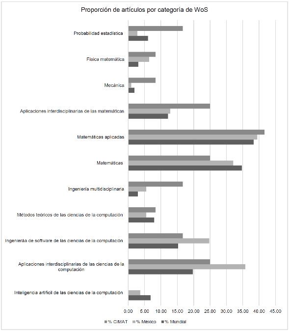 En un contexto global, la proporción de artículos indizados por cada una de las categorías de la base de datos Web of Science (WoS), los temas en los que el CIMAT genera conocimiento resultan consistentes con la producción mundial. Las temáticas identificadas en la base de datos son: mathematics applied (matemáticas aplicadas), mathematics (matemáticas), mathematics interdisciplinary applications(aplicaciones interdisciplinarias de las matemáticas), computer science interdisciplinary applications (aplicaciones interdisciplinarias de las ciencias de la computación), computer science software engineering (ingeniería de software de las ciencias de la computación), statistics probability (probabilidad estadística), engenieering multidisciplinary (ingeniería multidisciplinaria), computer science theory methods (métodos teóricos de las ciencias de la computación), mechanics (mecánica) y physics mathematical (física matemática). Destaca de la producción institucional el campo de las aplicaciones matemáticas interdisciplinarias.